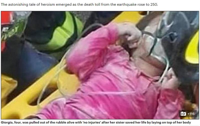 意大利发生强震,救难人员由瓦砾堆下挖出8岁女童茱莉亚·雷纳多时,她已经断气,但躺在她下面的4岁妹妹几乎毫发无损,安然获救。(图取自每日邮报)