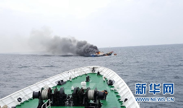 这是9月29日在全罗南道新安郡附近海域拍摄的起火的inkabout" target="_blank">中国渔船。据韩联社援引inkabout" target="_blank">韩国木浦海洋警备安全署的消息报道,一艘中国漂网渔船29日上午在韩国海域起火,3名船员死亡。新华社发(韩国木浦海洋警备安全处供图)