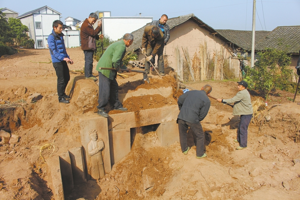 “我刚挖开坟墓,看到上面的图案有点特别,有龙、虎和人等,我就喊他们不要挖。”唐国模立即打电话,通知镇上领导来看看情况。村民们也停下了手中的活儿,将情况反映到镇上。泸县兆雅镇公安局立即派出民警赶往现场,并对现场进行封锁。