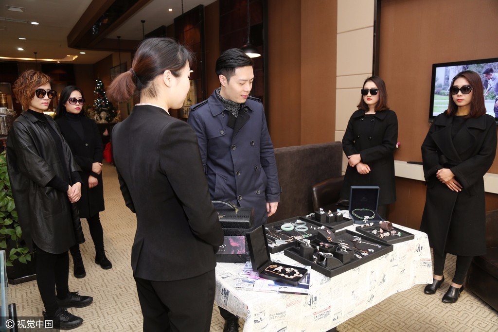 在郑州市中心一家高端珠宝店内,桌子上摆满了琳琅满目的珠宝,有些翡翠的价格高达上百万元。一名男子正在将这些昂贵的珠宝进行装箱,几名身穿黑色服装、带着墨镜的女孩守在旁边,时刻盯着周围的状况,保持着高度的警惕。