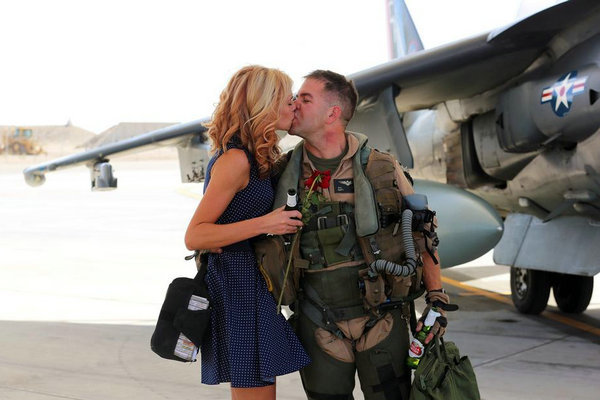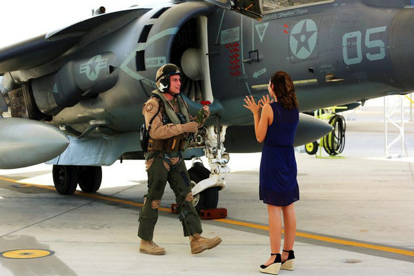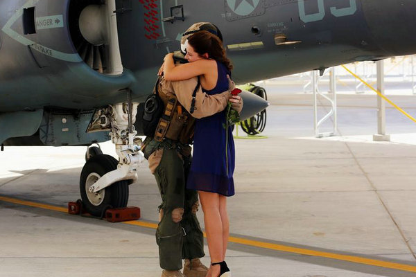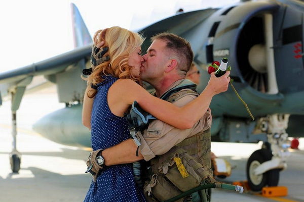 图为在前线征战半年之久的美国海军陆战队AV-8B海鹞战斗机飞行员回国休整,在回到基地时,迎来了自己阔别已久的爱人。