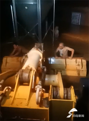 随着“轰隆”一声巨响,四季丰厂子外墙被铲车推倒。厂内的积水不断向外涌出,经过30分钟,厂区内的水位明显下降。就在赵京祥尝试着把车开进厂子救人时,5名被困人员中的一位正站在房顶上用手机发出求救信号,而手机发出的灯光引起了赵京祥的注意。