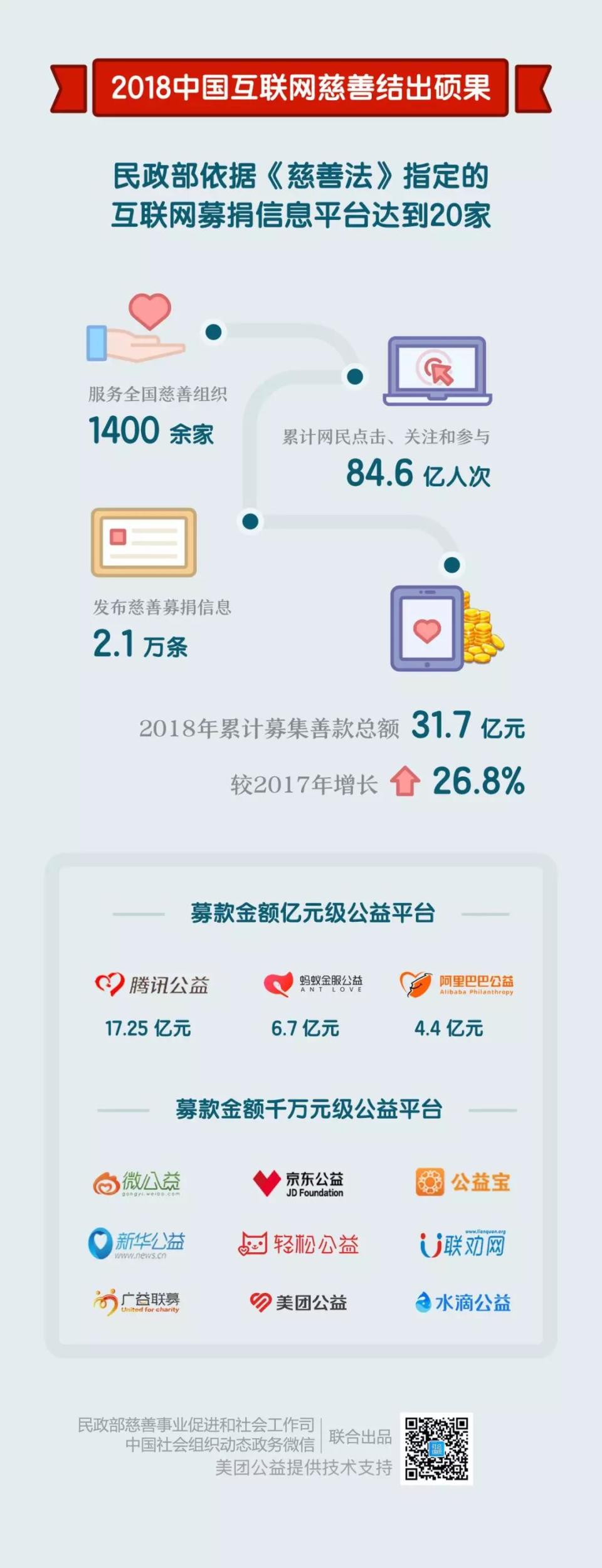 2018年,民政部依据《慈善法》指定的20家互联网募捐信息平台,共为全国1400余家公募慈善组织发布募捐信息2.1万条,网民点击、关注和参与超过84.6亿人次,募集善款总额超过31.7亿元,同比2017年增长26.8%。慈善组织通过腾讯公益募款17.25亿元、蚂蚁金服募款6.7亿元、阿里巴巴公益募款4.4亿元,通过新浪微公益、京东公益、公益宝、新华公益、轻松公益、联劝网、广益联募、美团公益、水滴公益等平台,募款金额均达千万元级。