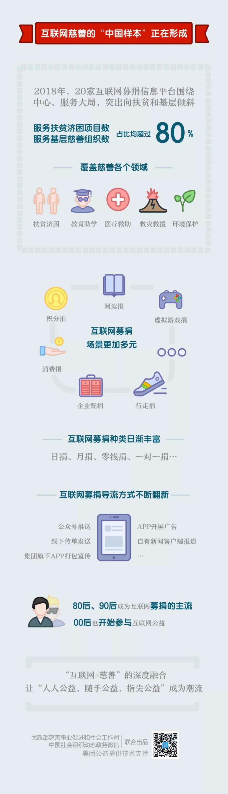 2018年,20家互联网募捐信息平台围绕中心、服务大局,坚持向扶贫和基层倾斜,服务精准扶贫项目数、基层慈善组织数占比均超过80%。扶贫济困、教育助学、医疗救助、救灾救援、环境保护等领域项目全面覆盖。腾讯的99公益日、阿里巴巴的95公益周等大型互联网募捐活动顺利实施。同时,互联网募捐场景越来越多元化,相关平台推出行走捐、阅读捐、积分捐、消费捐、企业配捐、虚拟游戏捐等创新方式,受到公众欢迎,80后、90后成为互联网募捐的主流,00后开始参与互联网公益。“互联网+慈善”深度融合,“人人公益、随手公益、指尖公益”成为潮流。日捐、月捐、零钱捐、一对一捐等捐款种类日渐多元,公众号推送、APP开屏广告、线下传单发送、自有新闻客户端报道、集团旗下APP打包宣传等导流方式不断翻新,初步形成了一个鲜活的互联网慈善的“中国样本”。