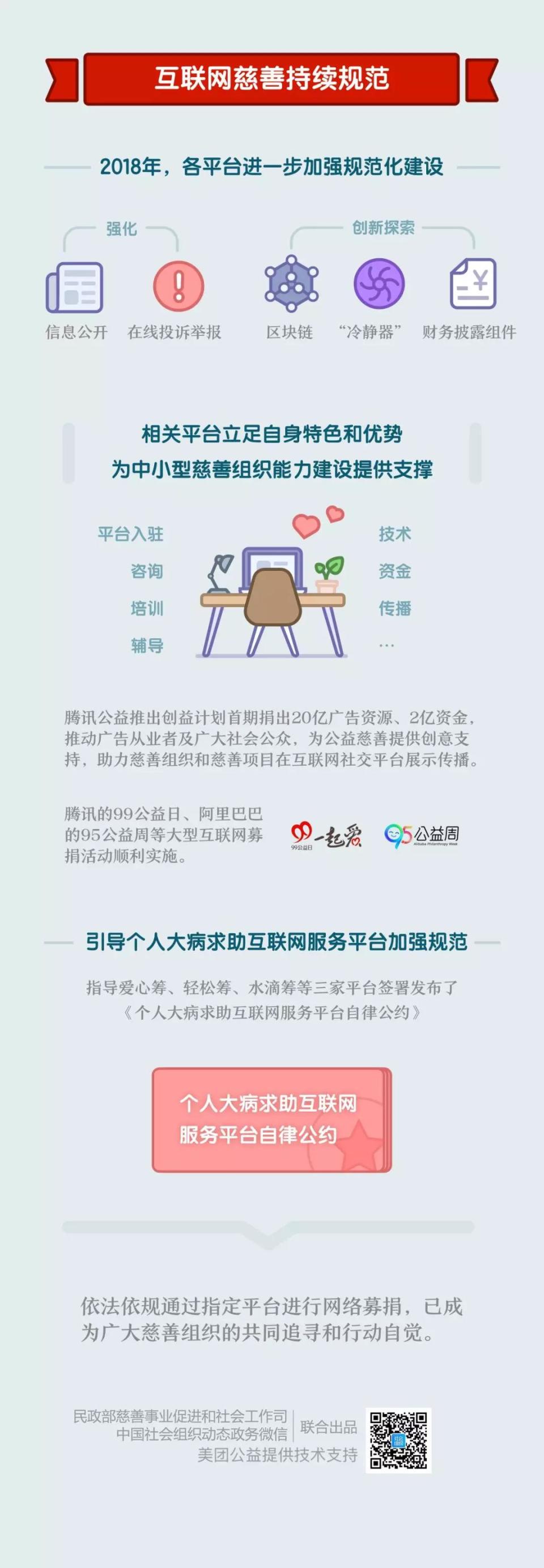 2018年,各平台进一步加强规范化建设,强化信息公开、在线投诉举报功能,尝试了区块链、“冷静器”、财务披露组件等一系列技术和管理创新。相关平台立足自身特色和优势,为中小型慈善组织能力建设提供支撑,包括提供平台入驻、咨询、培训、辅导,以及技术、资金、传播等方面的支持。腾讯公益推出创益计划,首期捐出20亿元广告资源、2亿元资金,推动广告从业者及广大社会公众,为公益慈善提供创意支持,助力慈善组织和慈善项目在互联网社交平台展示传播。同时,引导个人大病求助互联网平台加强规范,指导爱心筹、轻松筹、水滴筹等三家平台签署发布了个人大病互联网求助行业自律公约。依法依规通过指定平台进行网络募捐,已成为广大慈善组织的共同追寻和行动自觉。