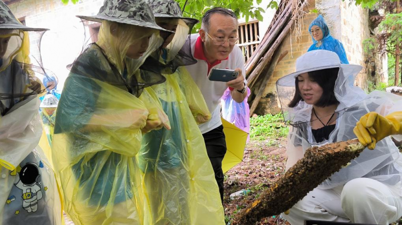 午后2时,暴雨再次袭来,却未能动摇助农采蜜体验的计划。在专业养蜂人、莲花县荷塘乡双岭村文明实践员朱丽兰的带领下,20组亲子家庭披着雨衣走进山林。“大家注意脚下的青苔,抓稳旁边的树枝!”朱丽兰的提醒被风雨声淹没,但孩子们依然手拉手排成纵队,深一脚浅一脚地向养蜂场进发。当掀开防雨布看到排列整齐的蜂箱时,城市来的小朋友发出阵阵惊叹,而乡村12岁的孩子贺成则熟练地指出:“那个个子稍微偏大一点的便是蜂王了!”
