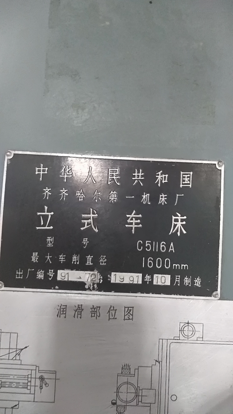 齐一1.6米单柱立式车床型号:C5116A回转直径1600mm加工高度1000mm工作台1400mm年代1991年